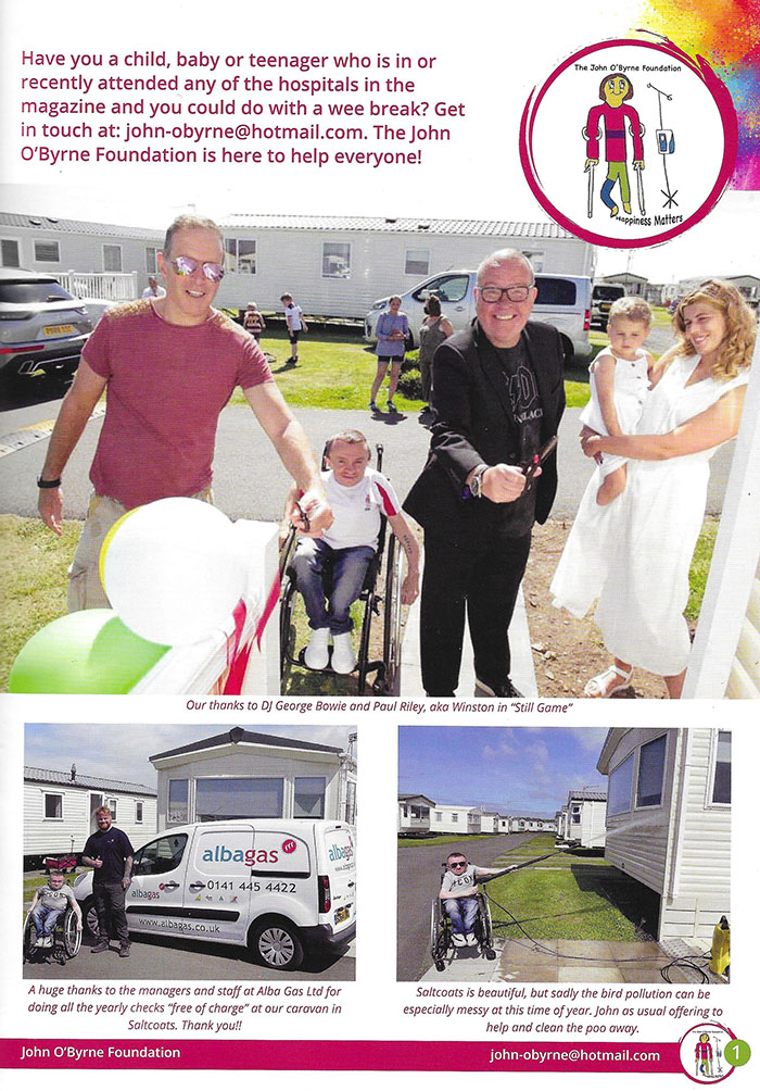 The John O'Byrne Foundation with the generosity of individuals, managed to open up the Foundation's first caravan in Saltcoats whose prime aim is to give kid's and their families suffering or are recovering from life threatening illnesses the opportunity of a wee break away from the stresses, both mental and physical they have all endured. Olivia Mccord from Clydebank was the first to enjoy the caravan, herself a cancer sufferer.
